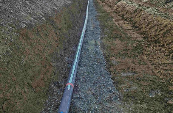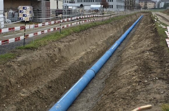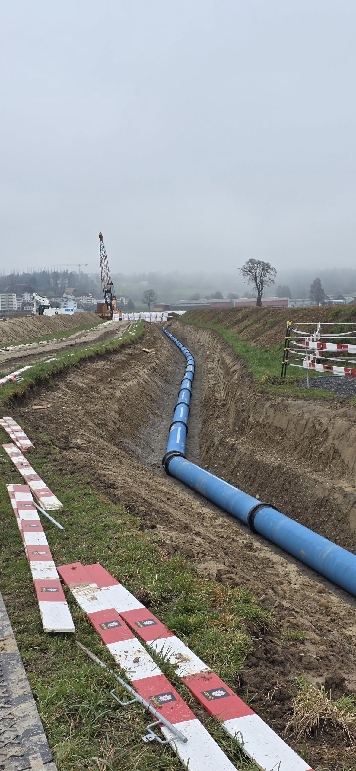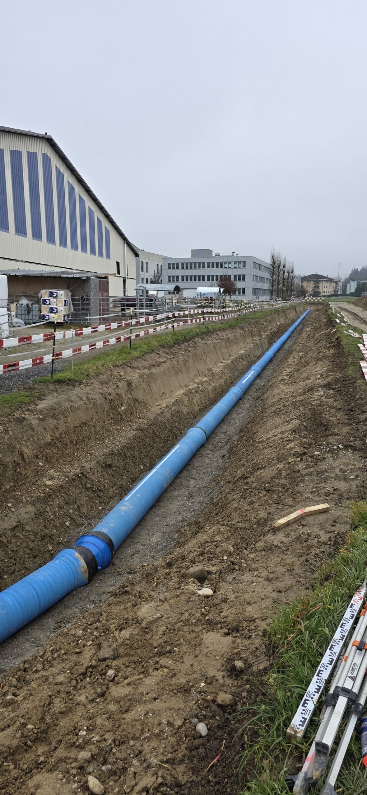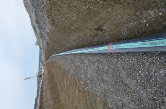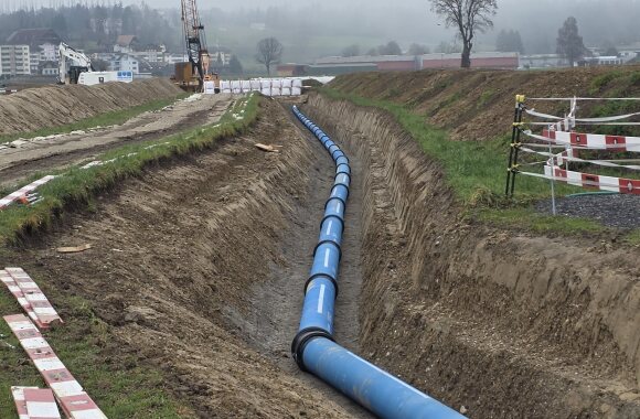 Weiter wurden ca. 280m Trinkwasserrohre mit einem Innendurchmesser von 400mm verlegt, welche im Endausbau das Pumpwerk mit der Transportleitung verbinden. Für die Entsorgung von anfallendem Schmutzwasser wurde eine ca. 230m lange Pumpendruckleitung (Doppelrohsystem, Rohr in Rohr) verlegt.