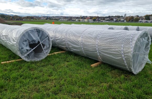 Die grossen Filterrohre aus Chromstahl werden mit dem Bohren in die Erde abgesenkt und bilden dann die eigentliche Wasserfassung.