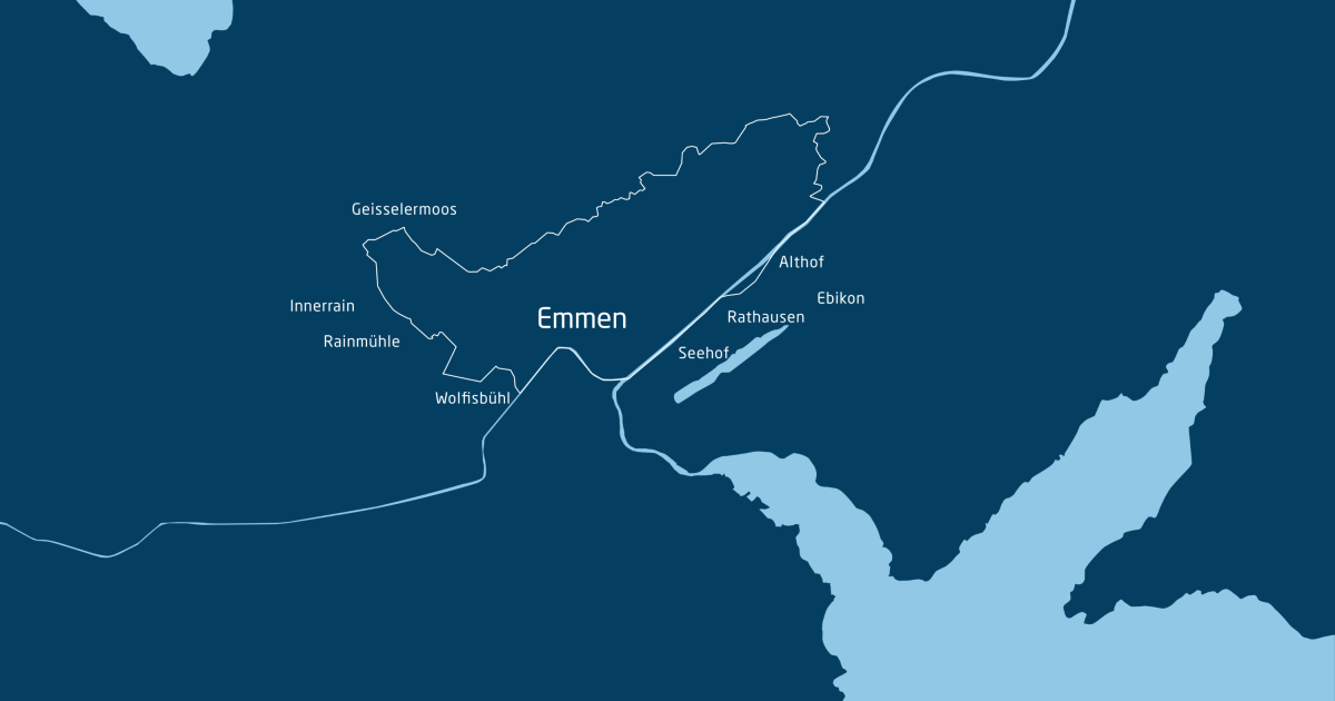 - Gemeinde Emmen (ohne die Gebiete Wolfisbühl, Innenrain, Rainmühle und Geisselermoos)